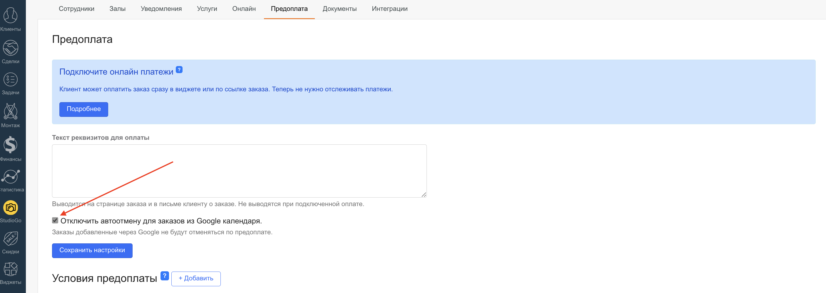 «Профиль компании» → «Предоплата» → включить чекбокс «Отключить автоотмену для заказов из Google Календаря».