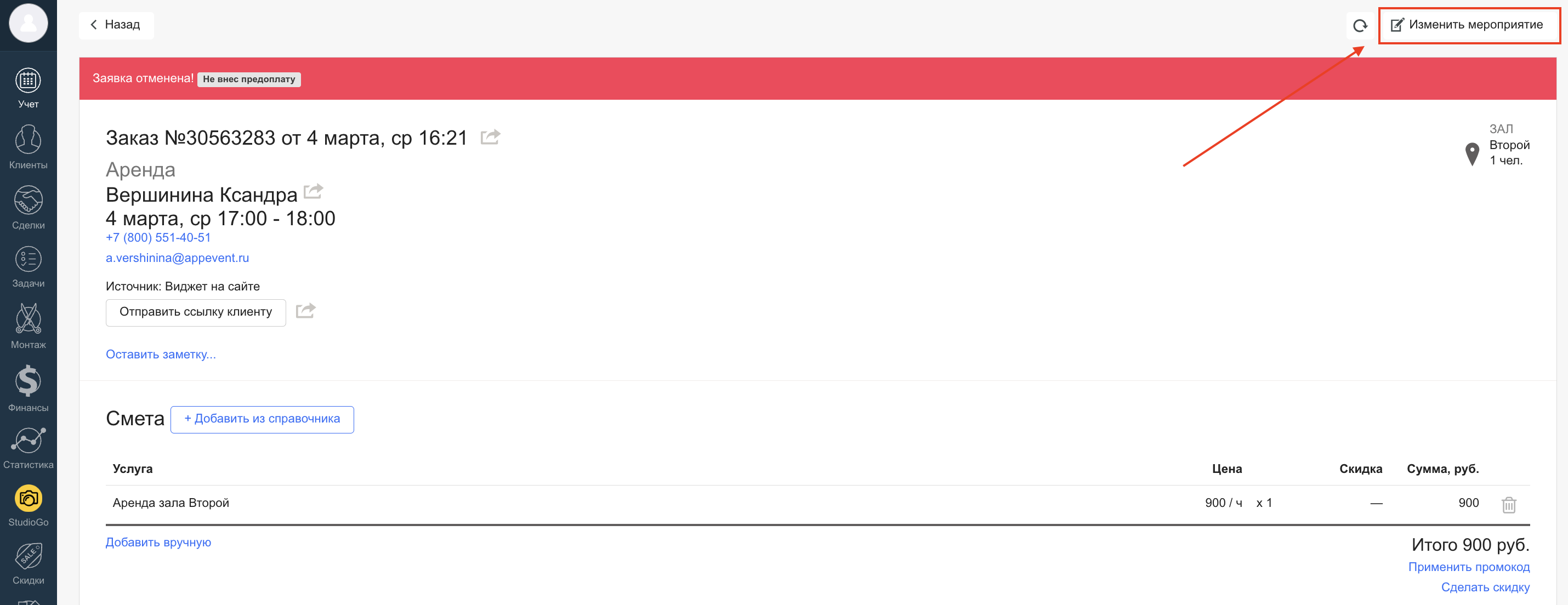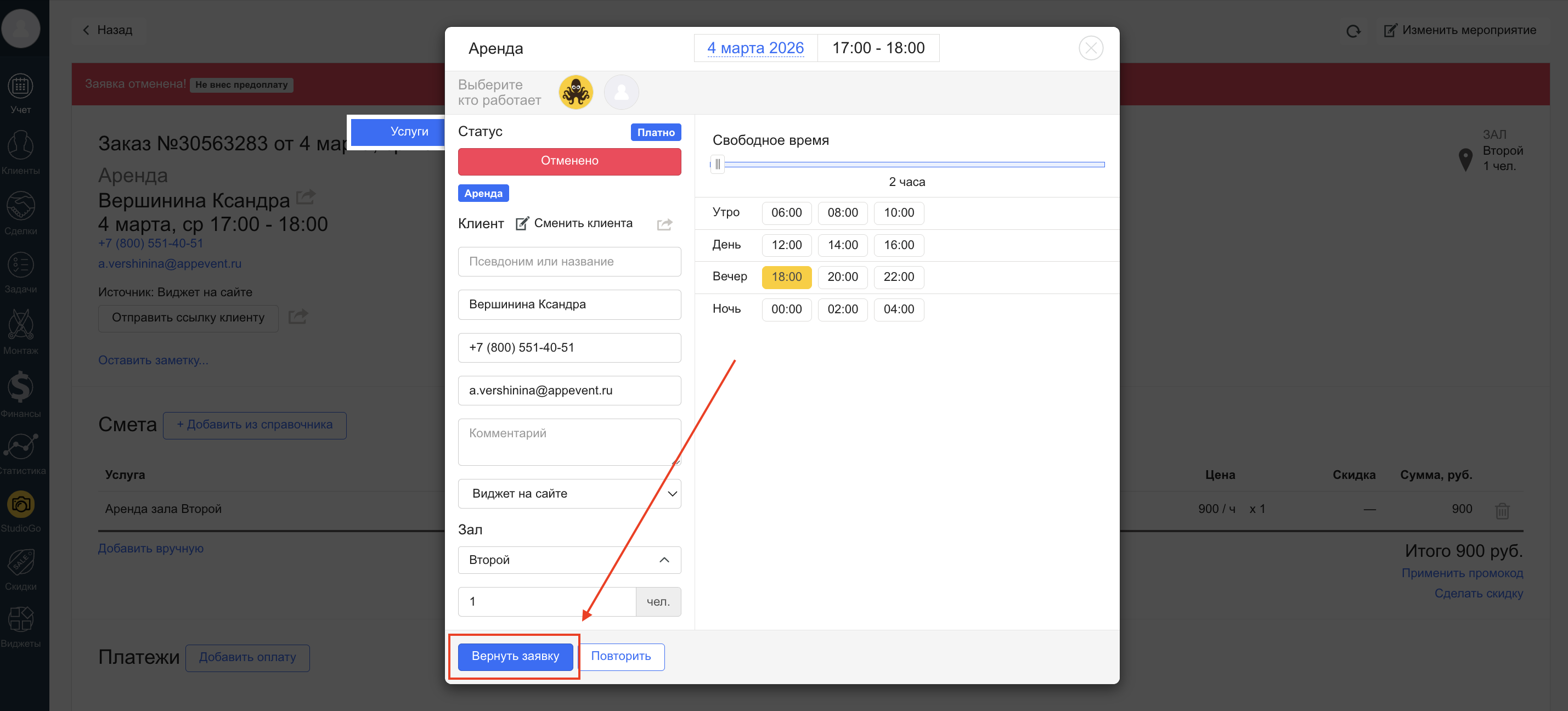 Решение: верните заказ из отменённых в карточке заказа по кнопке «Изменить мероприятие» → «Вернуть заявку».