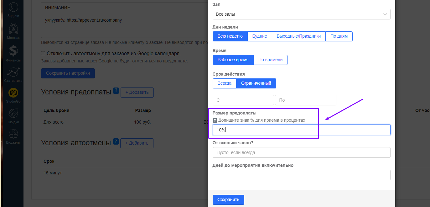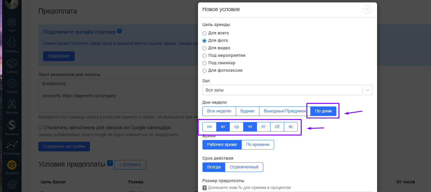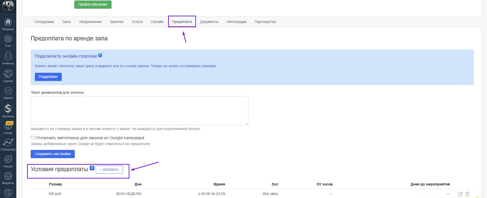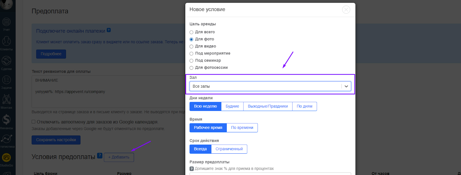 Доступно на тарифах с арендой. Выберите, на какой зал распространяется условие.