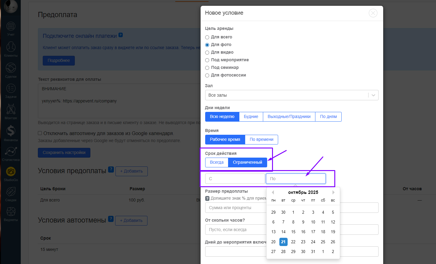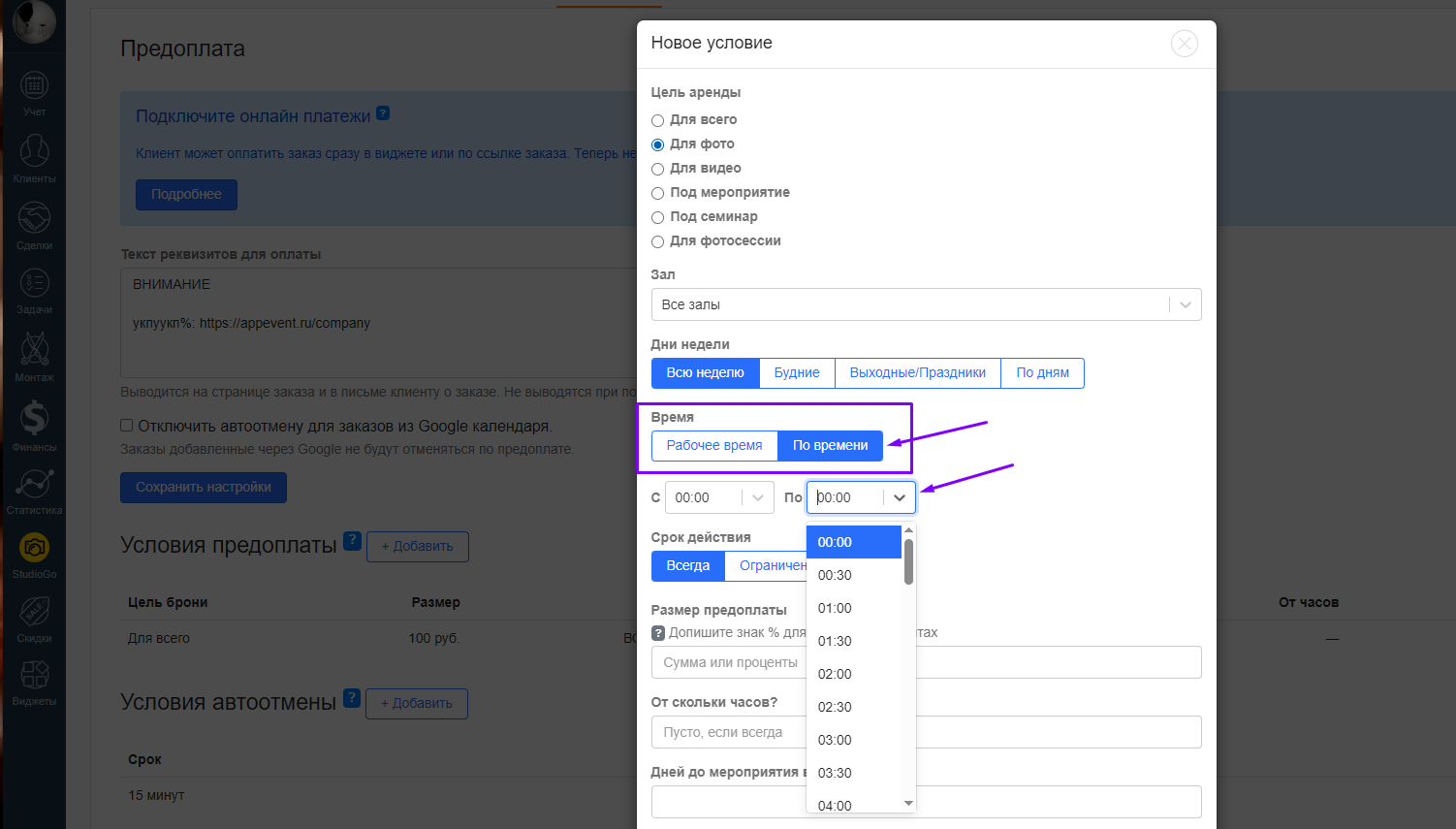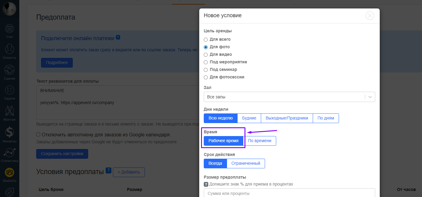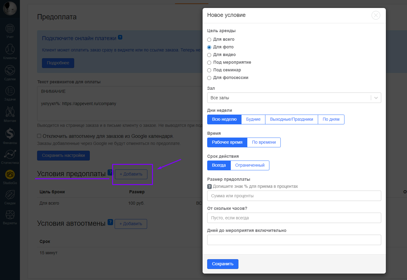 Условия предоплаты позволяют управлять тем, когда и в каком размере клиент должен внести оплату при бронировании. Вы можете создать одно универсальное правило или несколько условий для разных ситуаций — например, для выходных, вечернего времени или длительных бронирований.