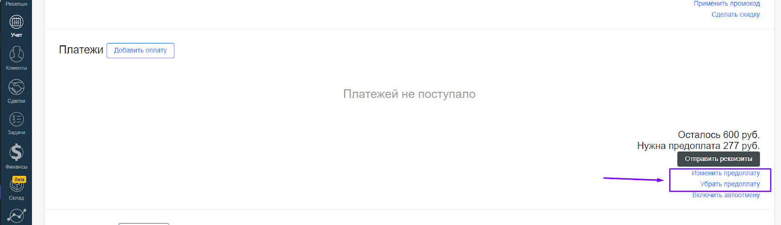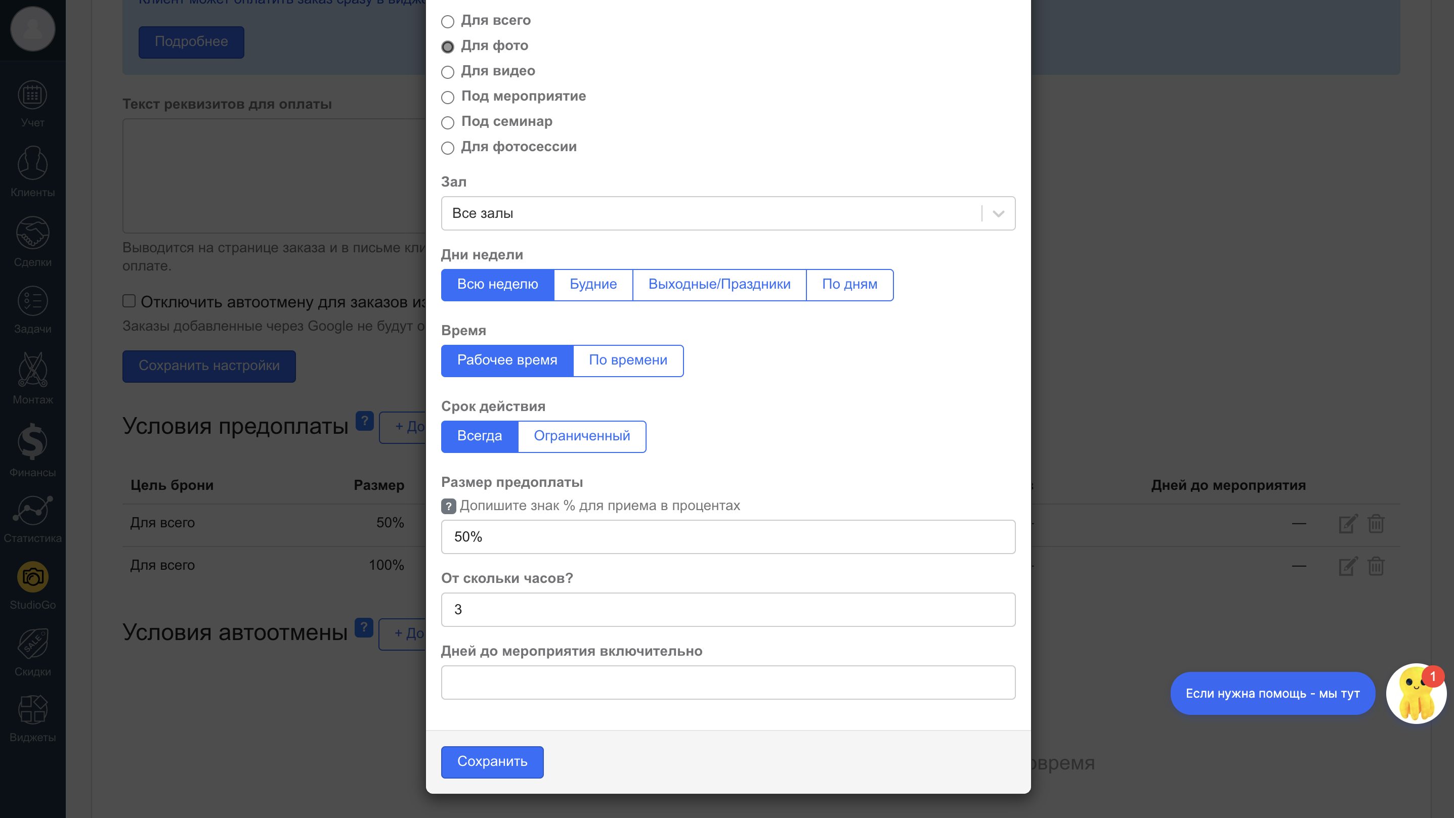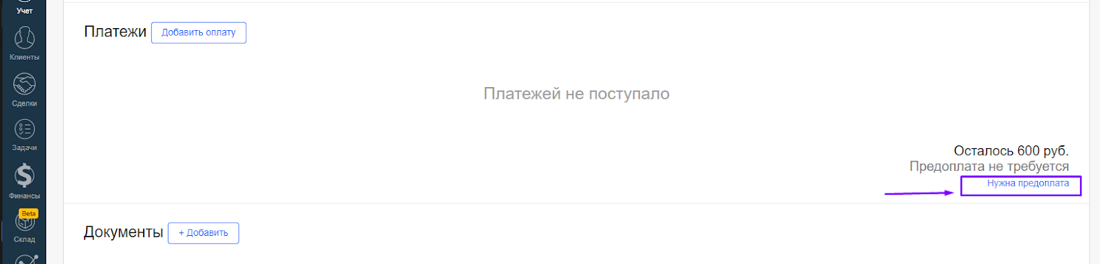 Также вы можете выбрать, каким способом принимать предоплату — автоматически через онлайн‑платежи или вручную по реквизитам. Подробнее о методах приёма оплаты — в статьях: