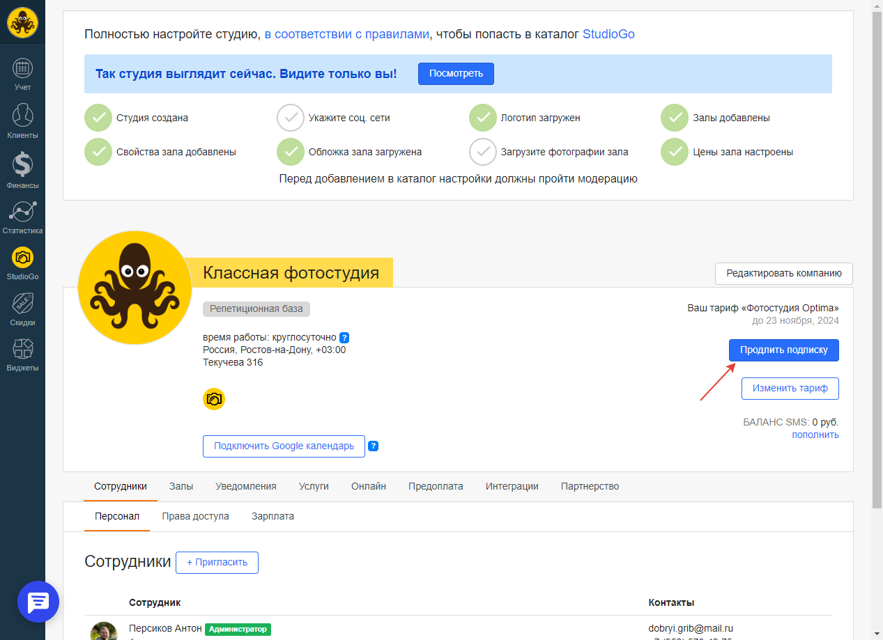 Также на продукте Фотостудия тарифах Optima и Profi, доступно 5 бесплатных залов, а на тарифе Lite доступно 3 бесплатных зала, доплата за каждый последующие зал составляет 200 рублей в месяц к стоимости подписки.