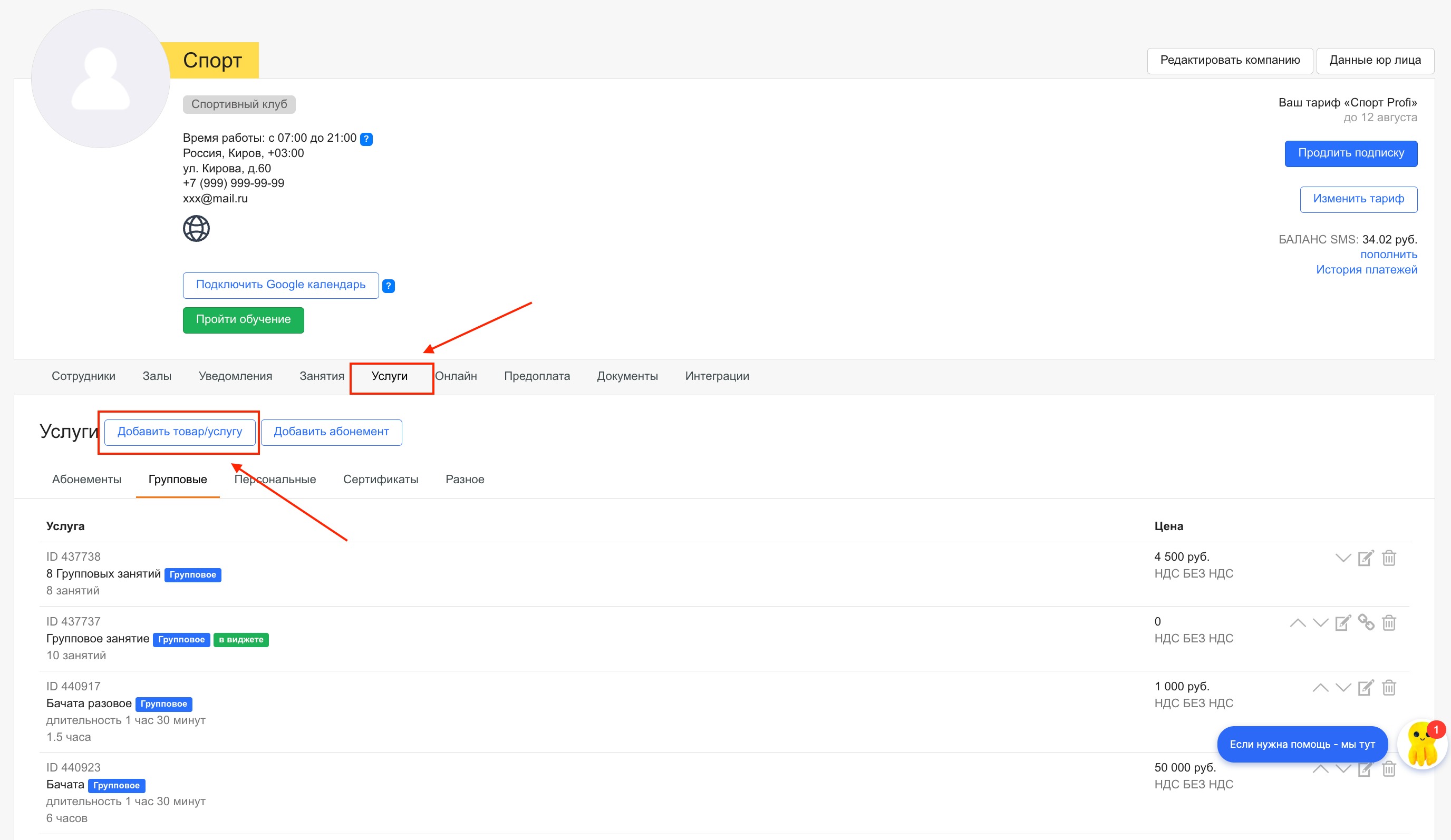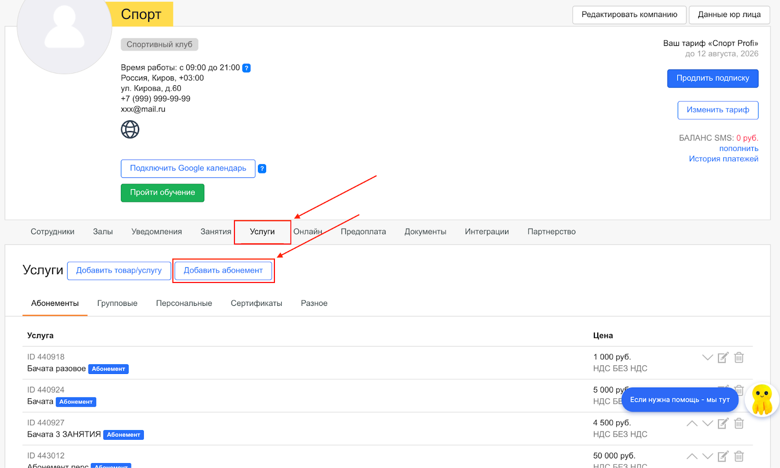 В разделе «Услуги» нажмите «Добавить абонемент».