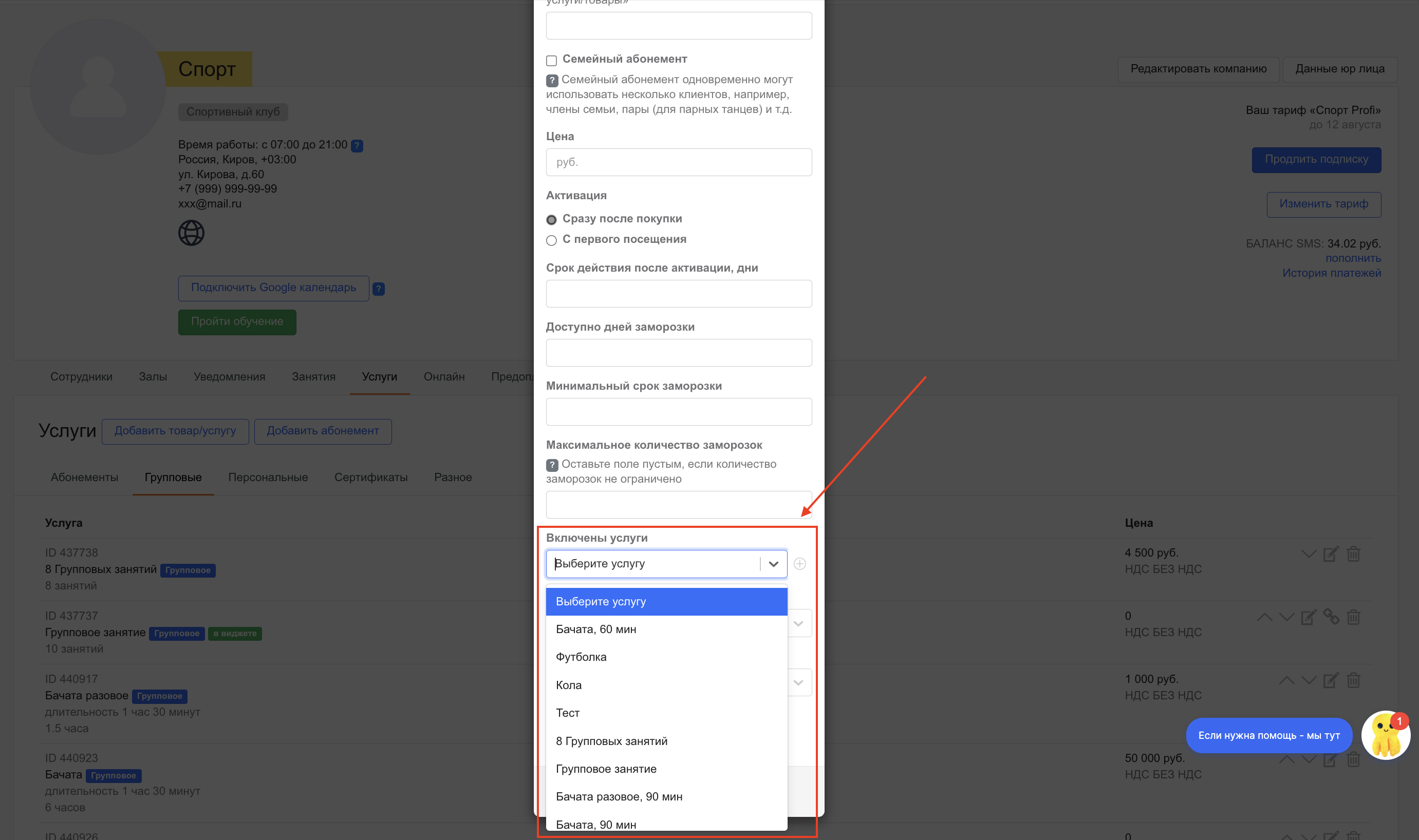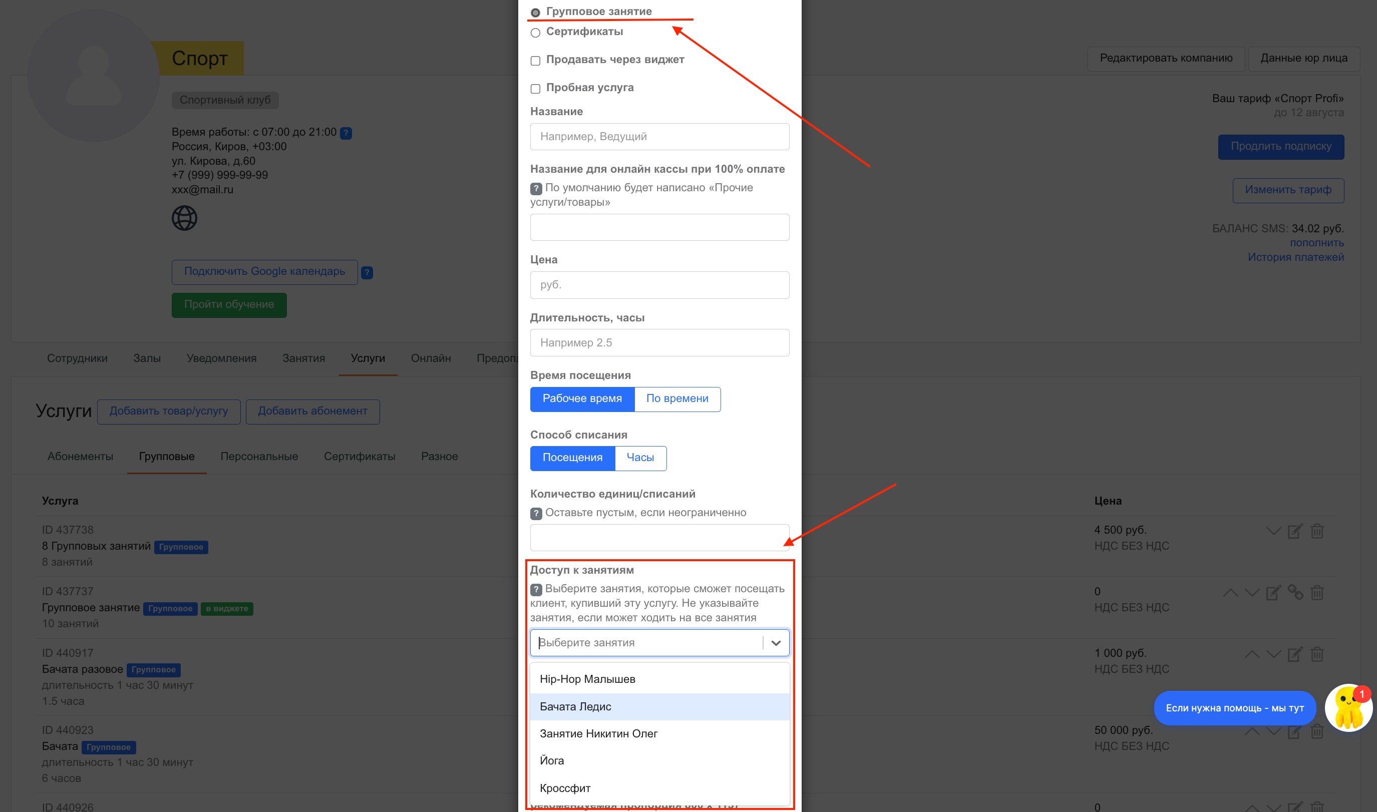 В услуге выберите тип услуги — «Персональное занятие» или «Групповое занятие». Затем заполните поле «Доступ к занятиям» и укажите занятие, которое только что создали.