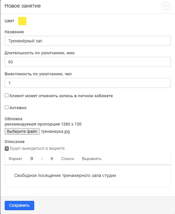 Перейдите в «Профиль компании» → «Занятия» и создайте новое занятие, например «Тренажёрный зал».