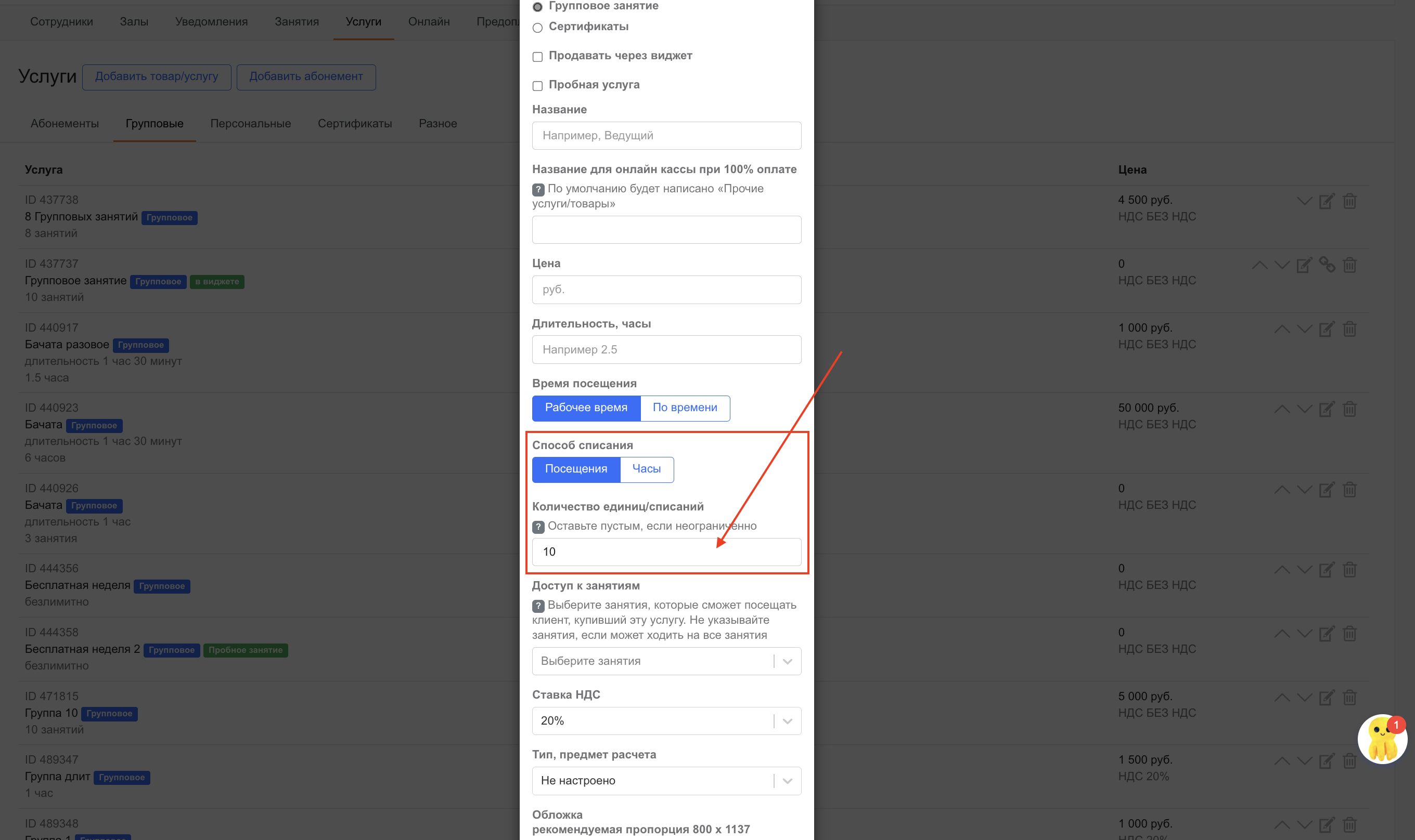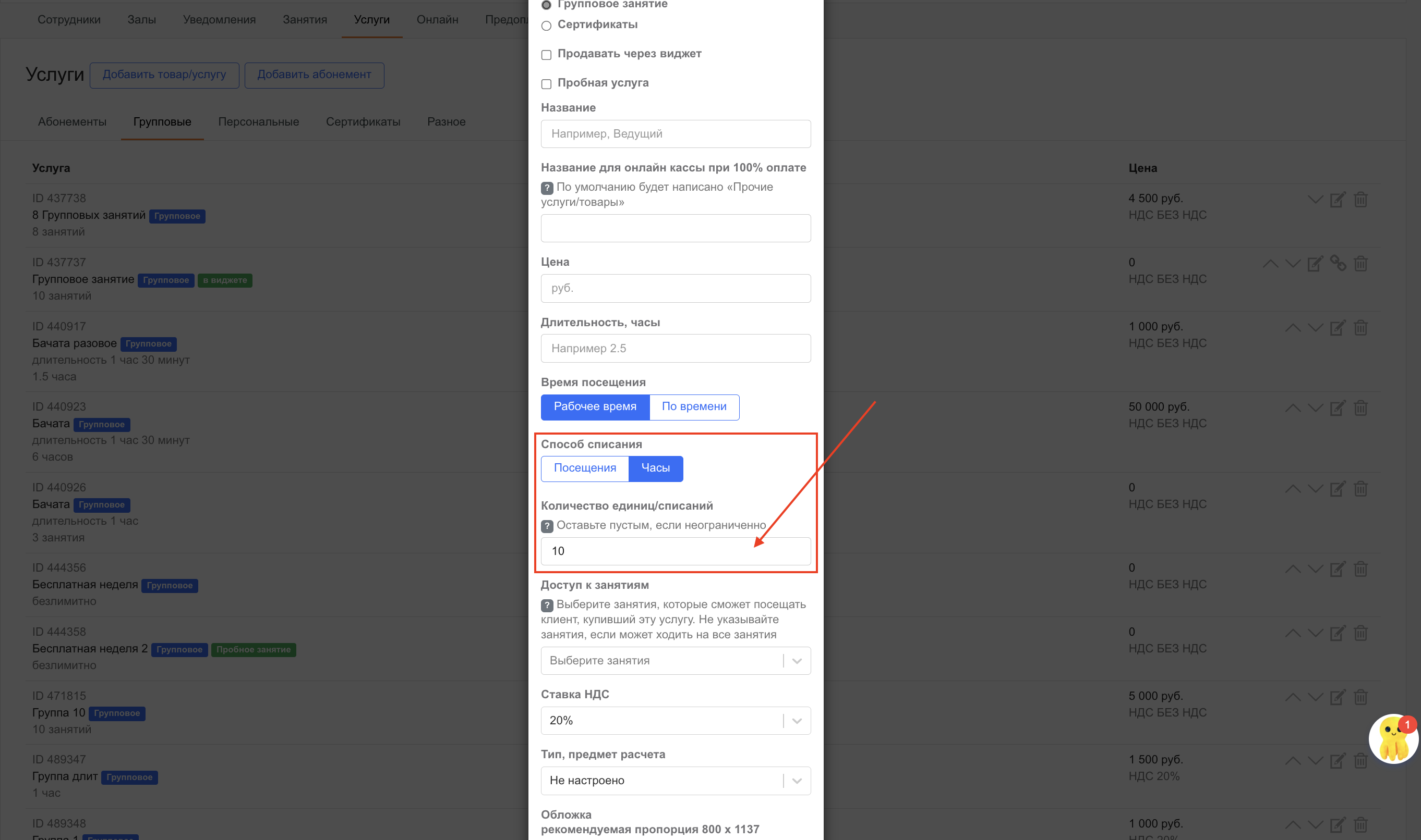 Если поле «Количество единиц/списаний» оставить пустым, абонемент будет безлимитным по посещениям.