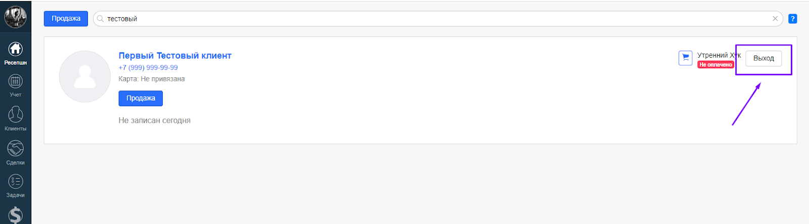 Когда клиент покидает зал снова найдите его в разделе «Ресепшен» и нажмите «Выход».