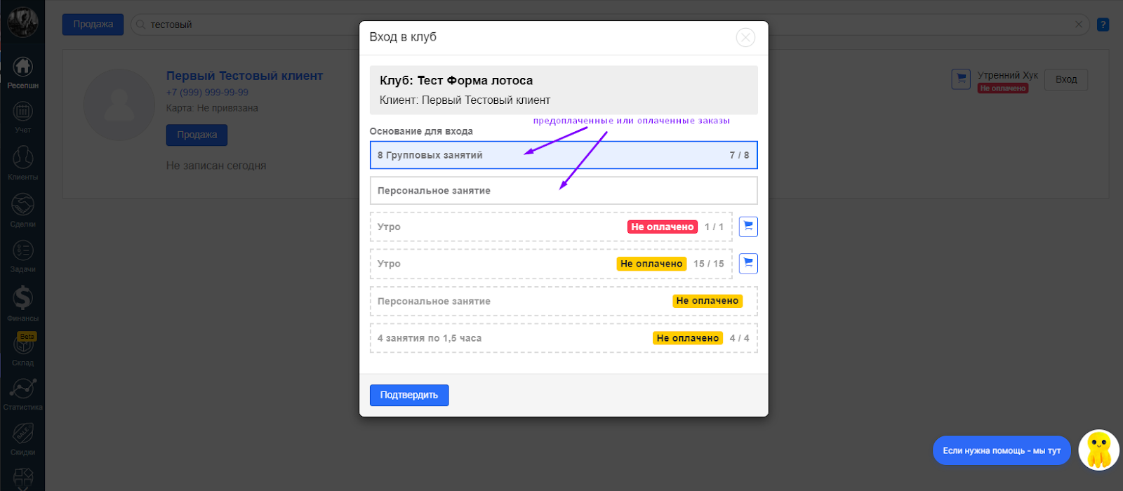 Шаг 3. Выберите услугу или абонемент для списания и нажмите «Подтвердить».